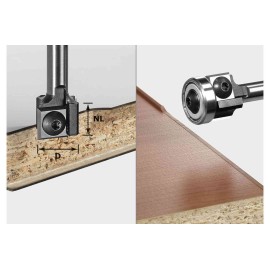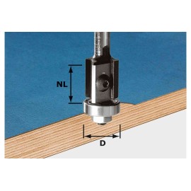 HW Replaceable Knife, Chamfer Bit with Bearing Optimized bearing mount suitable for 1/4“ ball bearing guide or no ball bearing guide 1/2" x 1/2" (12 x 12 mm) reversible carbide blade is replaceable D 1-1/16" (27 mm)  GL 2-1/8" (55 mm)  NL 5/16" (8 mm)..